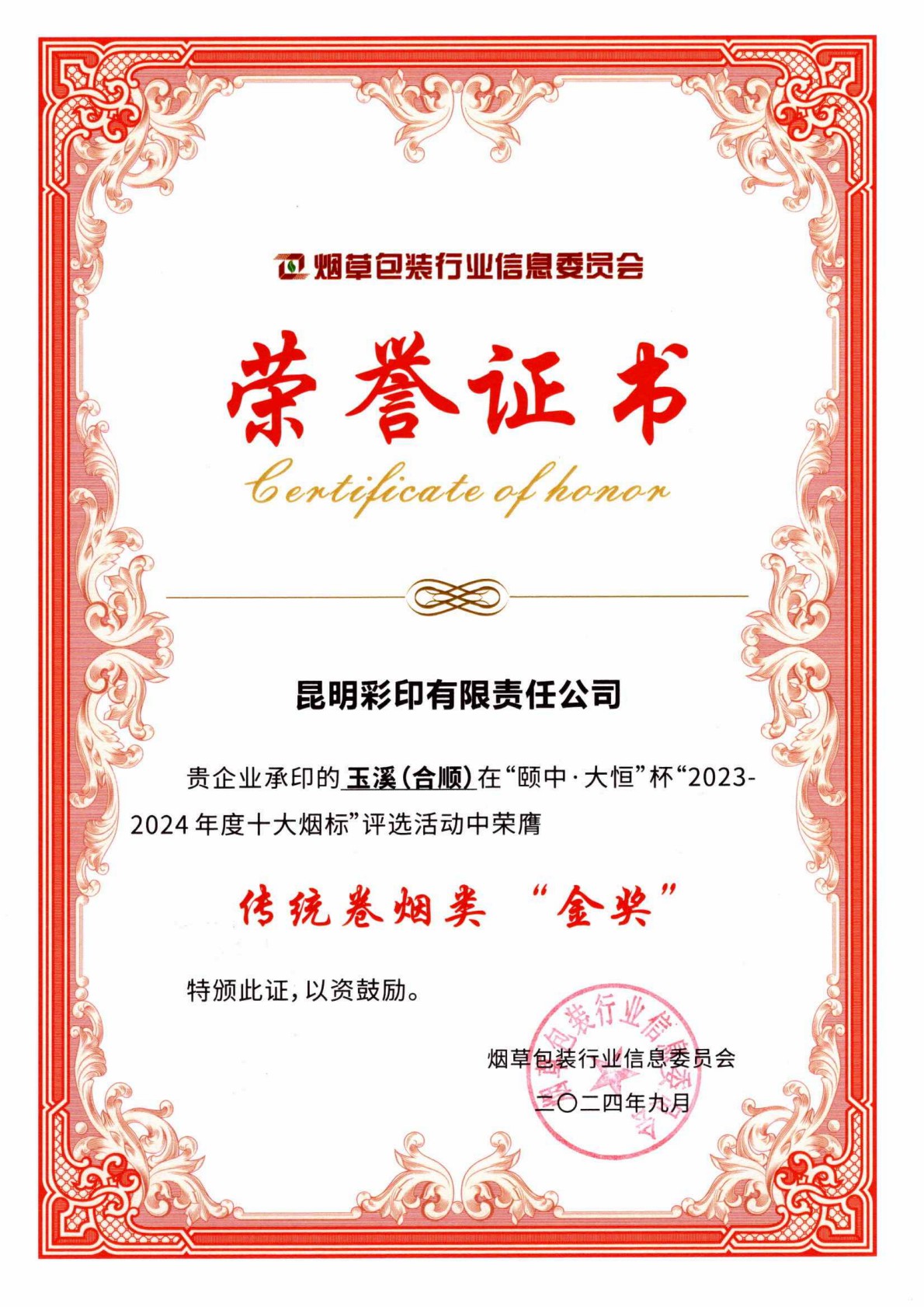 “颐中·大恒”杯“2023-2024 年度十大烟标”传统卷烟类“金奖”