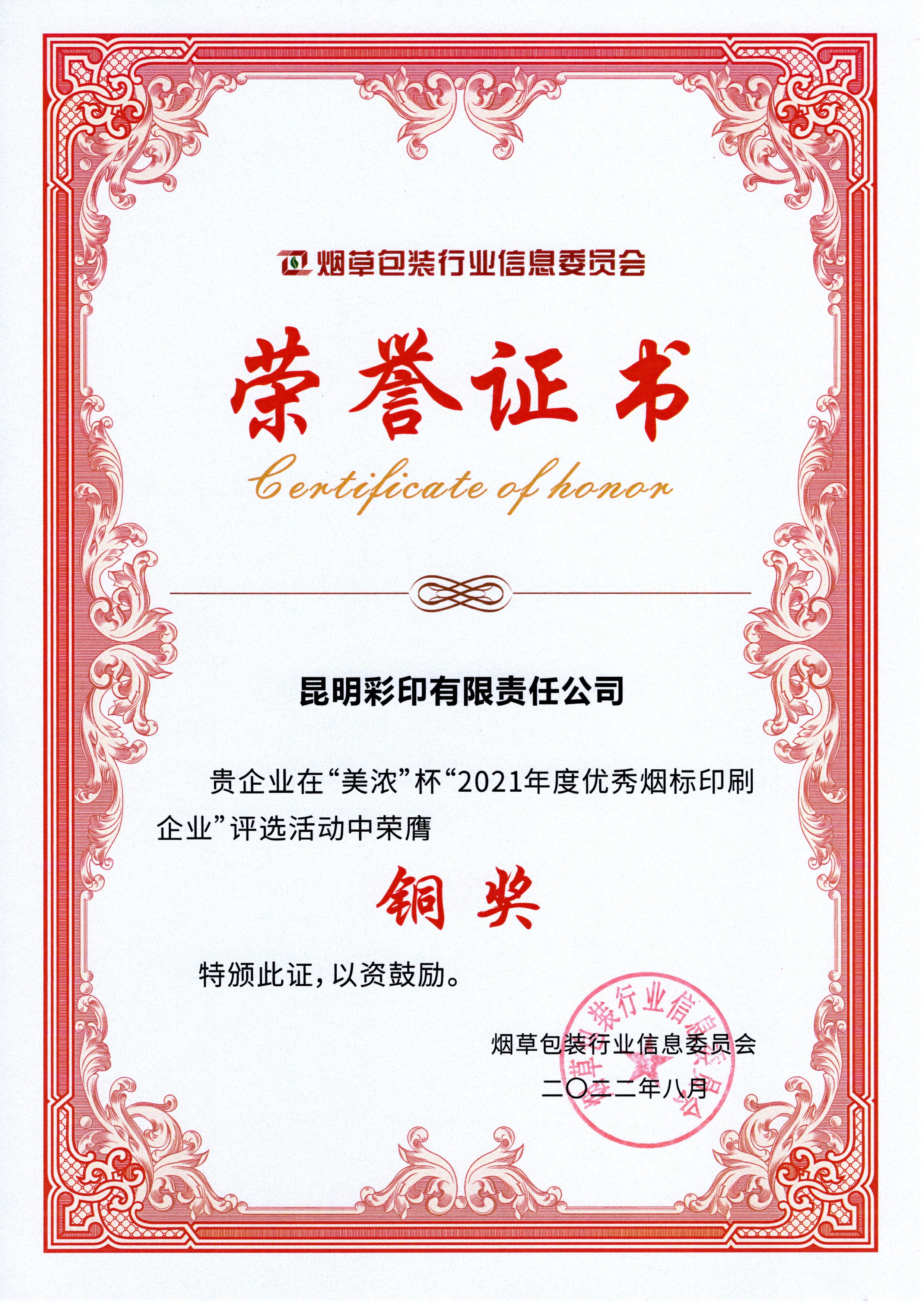 美浓杯2021年度优秀烟标印刷企业铜奖证书